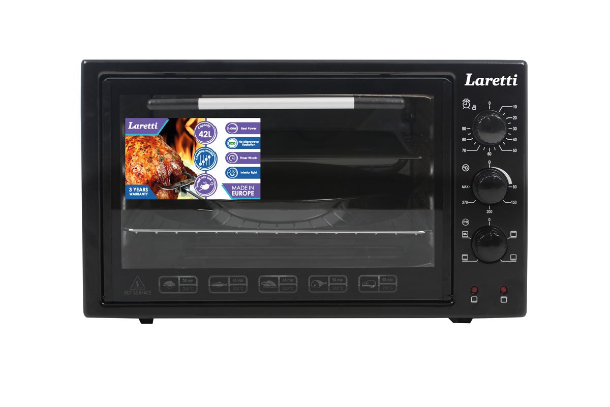 Электрическая печь средних размеров (42л), мощностью 1500 Вт с антипригарным внутренним покрытием и дверцей из двойного стекла.